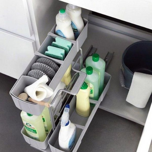 An under sink organizer helps utilize the cabinet space below the sink for storing cleaning supplies, detergents, and other kitchen utilities. Its moisture-resistant design ensures durability even in damp conditions.